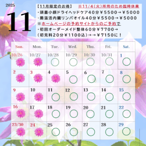【11月末迄の期間限定特典】・頭蓋小顔ドライヘッドスパ40分¥5500→¥5,000(税込)・腸温活リンパリリース40分¥5500→¥5,000(税込)※ホームページの予約サイトからのご予約で、初回オーダーメイド整体60 […]