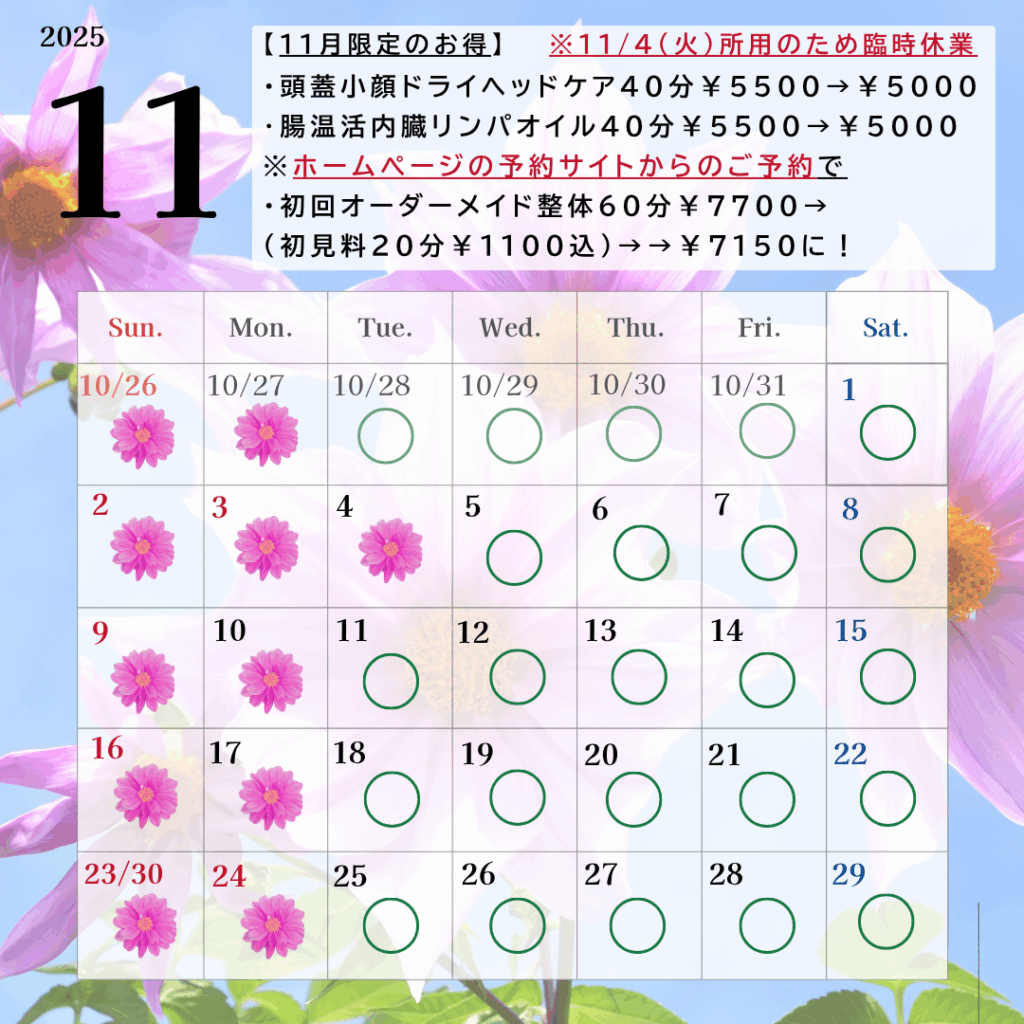 ※ホームページの予約サイトからのご予約で、初回オーダーメイド整体60分¥7700(初見料20分¥1100含む)が→¥7150で受けられます!